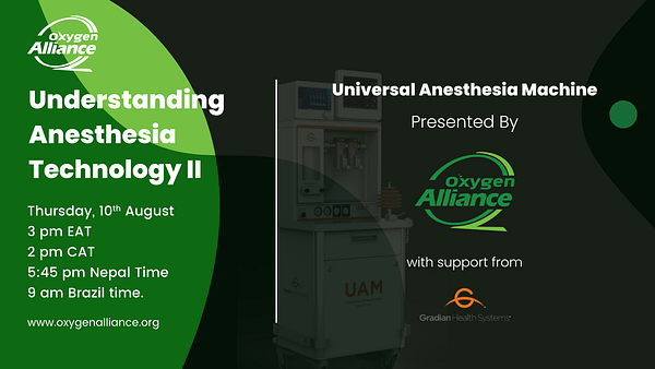 Date: 10th August 2023, 3pm EAT The Oxygen Alliance is happy to extend an exclusive invite to you for our upcoming webinar on “Understanding Anesthesia Technology: Exploring the Universal Anesthesia Machine” happening on 10th August 2023 at 3:00 pm EAT. The Universal Anesthesia Machine is an integral component of modern medical facilities, ensuring the safe and effective administration of anesthesia during surgical procedures. Here’s what you can expect to learn during this webinar: 1. The general makeup of the Universal Anesthesia Machine and its operation 2.